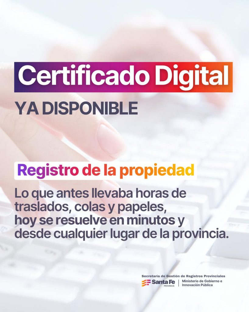 La Secretaría de Gestión de Registros Provinciales informa que el Certificado Digital del Registro de la Propiedad Inmueble ya se encuentra plenamente operativo y, desde ahora, habilitado para todos los profesionales alcanzados por la Ley Provincial N.º 6435 (abogados, escribanos y agrimensores).
